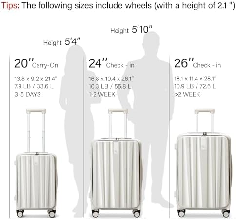 【DIMENSION】26 inch luggage measures 18.1″x11.4″x28.1″,including wheels and handles, weight 10.9LB. Packing Capacity 72.6 L. Checked luggage airline approved.