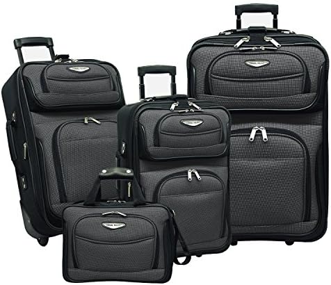 Travel in style with this expanded Amsterdam 4-piece luggage set. Deluxe set includes four packing cubes to help organize your belongings. Versatile luggage set offers luxury and durability. Available in Red, navy, orange, and gray color options. Luxurious superior two-tone polyester fabrication with PVC backing. Deluxe internal retractable push-button handle system. In-line skate wheels with corner protectors. Expandable feature on all uprights. Multiple front zippered pockets. Comfortable top and side carry handles. Bag clasp for toting additional bags. Large zippered mesh lid pocket and dual shoe pockets. Full imprinted lining. Elastic tie down straps helps secure and compress belongings. ID window on back panel. Travel tote has adjustable shoulder strap with padded handle. Piggy back strap on back panel to slip over upright handle. Spacious main compartment with a top center zippered opening. Product Dimensions: 29 inches high x 17 inches wide x 10 inches deep (expands to 12 inches deep) 9.5 lbs.; 25 inches high x 15 inches wide x 9 inches deep (expands to 11 inches deep) 8.5 lbs.; 21 inches high x 13 inches wide x 7.5 inches deep (expands to 10 inches deep) 7.7 lbs.; Travel tote: 15 inches high x 11 inches wide x 6 inches deep 2 lbs.